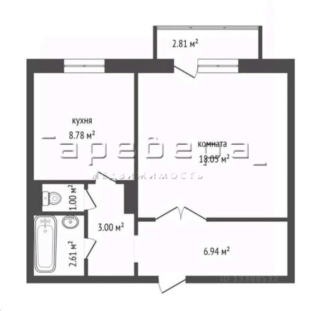 Общая площадь составляет 34 м2, жилая — 18 м2. Кухня просторная, площадью 9 м2, что позволяет комфортно разместить всю необходимую мебель и технику.
