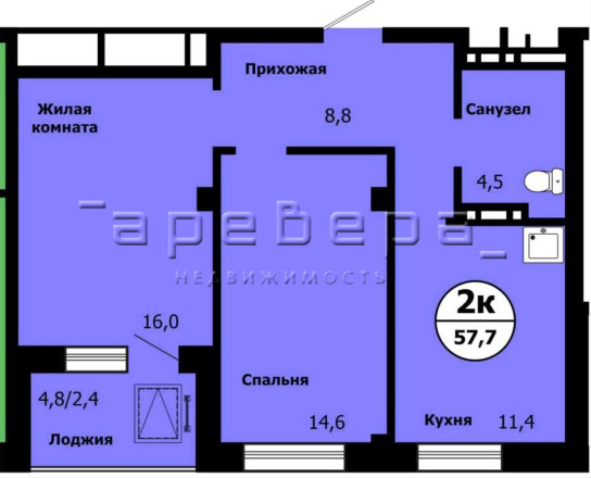 2-комнатная квартира. Состояние "Белый куб": белые стены, линолеум с плинтусом, унитаз, мойка на кухне, остекленный балкон.