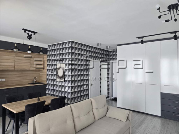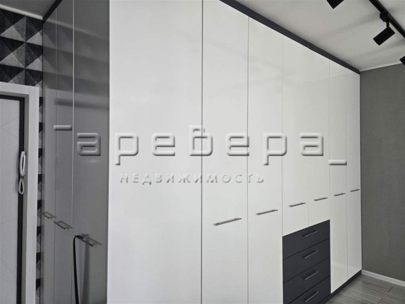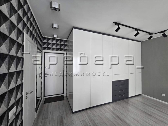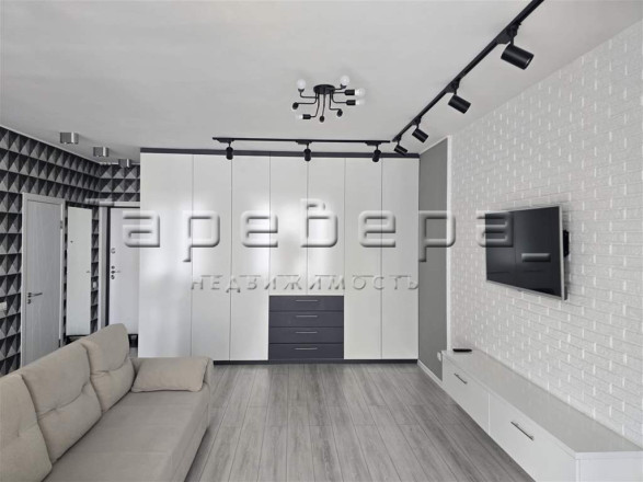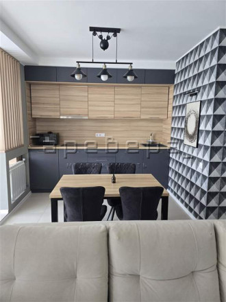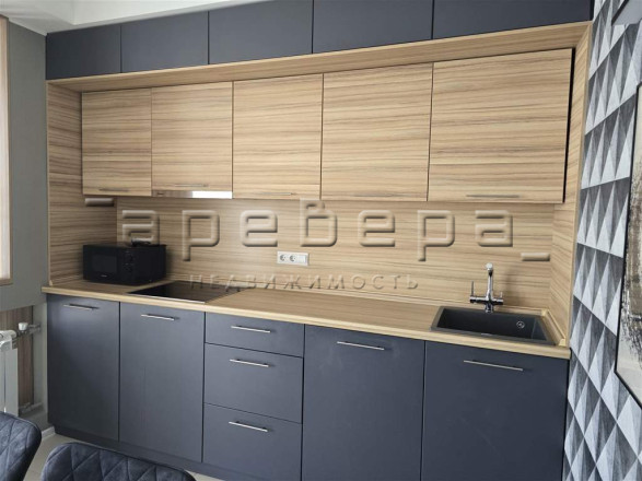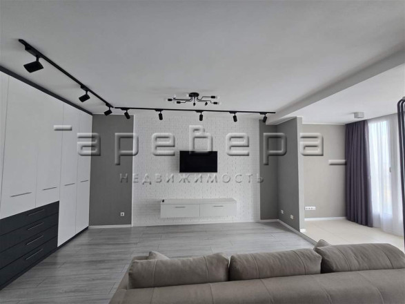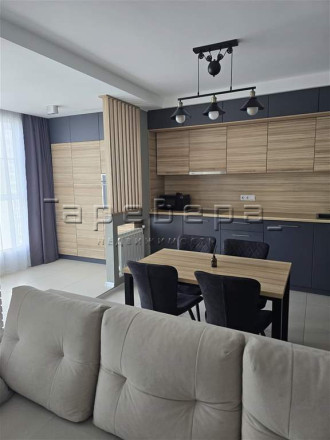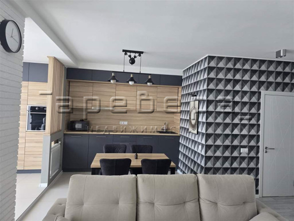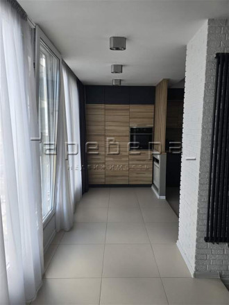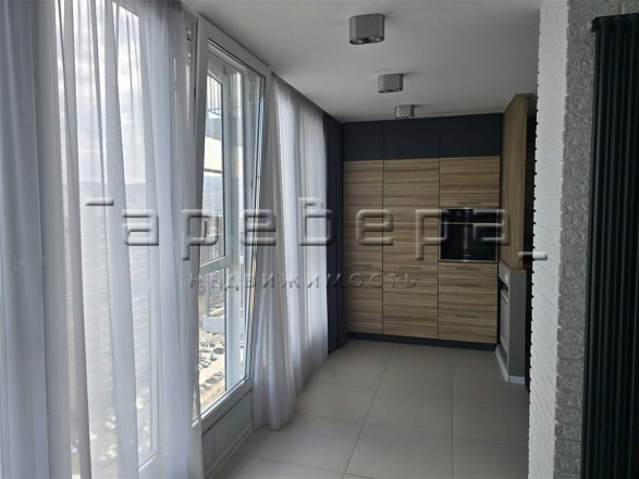 Планировка создает единое пространство кухни-гостиной. Проект включает встроенную мебель, дизайнерские светильники и полностью оснащенную кухонную технику.