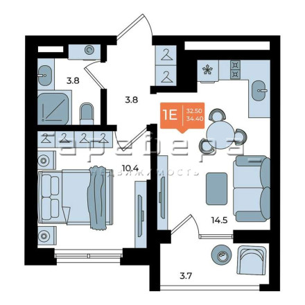 Компактная евро-двушка (34,4 м) с отдельной спальней